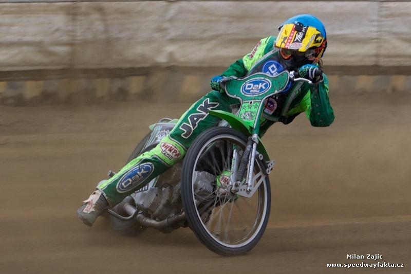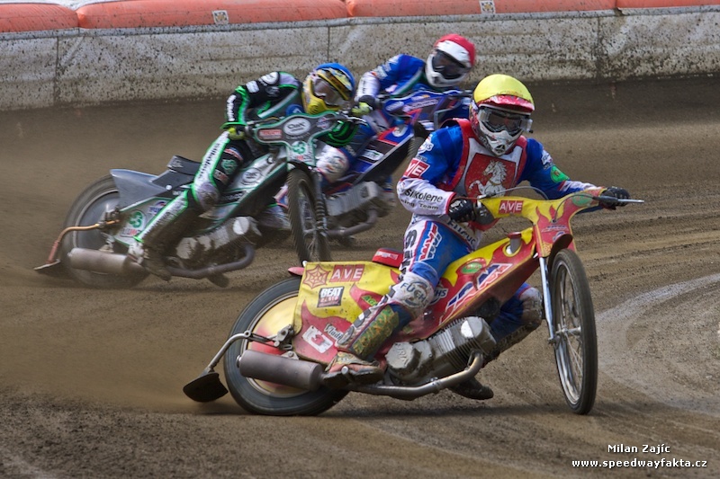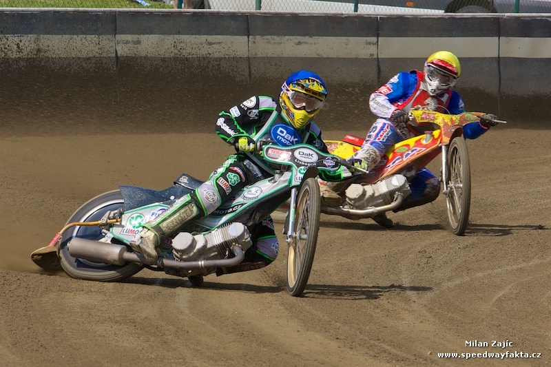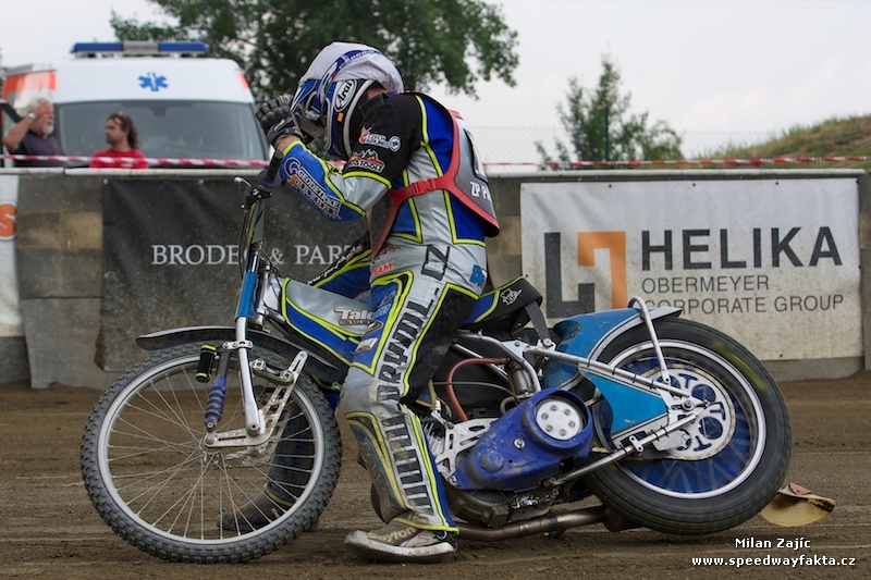 divisov_plzen.jpgzlata-prilba-pardubice.gifUVNITŘ FOTOREPORTÁŽ – Klíčový muž sestavy týmu DaK Moto Liebezeit Divišov-Plzeň Martin Vaculík hned ve své první jízdě lehce upadl, pak sice naskočil do tří jízd, ale dále už to kvůli bolestem ramena nešlo. To prakticky rozhodlo o osudu celého extraligového střetnutí, ke kterému do Divišova zajížděla Zlatá přilba Pardubice. Východočeši zvládli koncovku lépe a vezou si domů dva body za výhru 52:38, když si navíc ještě mohli dovolit nasadit svého nejlepšího závodníka Rune Holtu jen pětkrát.