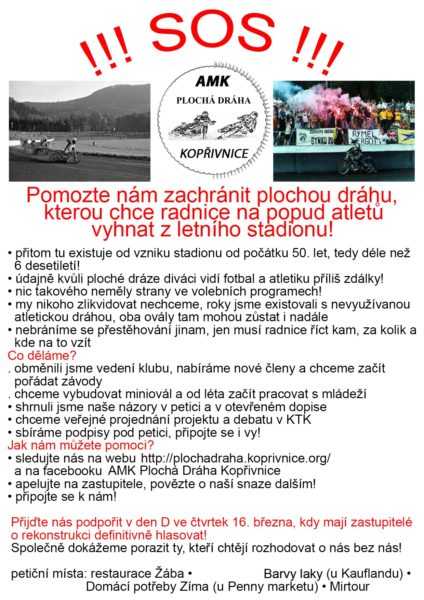 Kopřivnické webové stránky jedou na plné obrátky. Najdete zde mnoho informací o dění kopřivnického boje s radnicí. Stránky najdete na adrese http://plochadraha.koprivnice.org a na Facebooku AMK Plochá dráha Kopřivnice. Neváhejte a sdílejte, ať se o tom dozví co nejvíce lidí nejen v Kopřivnici.