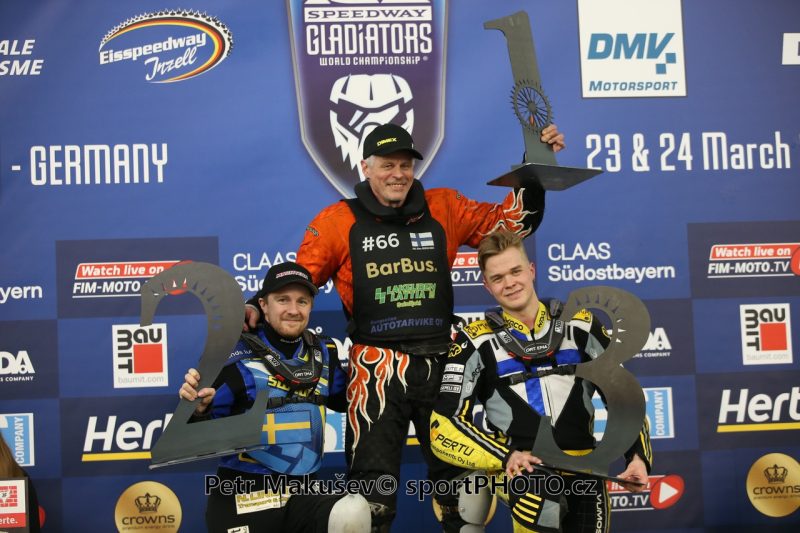 No a pak dvě bomby. Po mnoha letech se vrátil Aki Ala Riihimaki (57) a závodil neskutečně a nedělní finále poměrně jasně vyhrál. A to jel, dá se říci, na archaickém stroji možná třicet let starém. Musela se kvůli němu sejít speciální komise FIM a motocykl schválit. Nováček ve světové špičce Haikki Huusko není žádný junior. Je mu třicet jedna let a prý dělal v minulosti mechanika. Do startovního pole vnesl určitě svěží vítr a způsob, jakým předjel v nedělním finále sobotního vítěze Neidermaiera a dostal se na třetí místo, byl zážitkem. Takže v neděli byli na stupních vítězů dva Finové a početní fanoušci země jezer si mohli poslechnout „Kukulu“, tedy finskou hymnu. Niedermaier jezdil po oba dny skvěle, v sobotu i v neděli vyhrál základní část  a první den ve finále porazil vadnoucího Haarahiltunena.