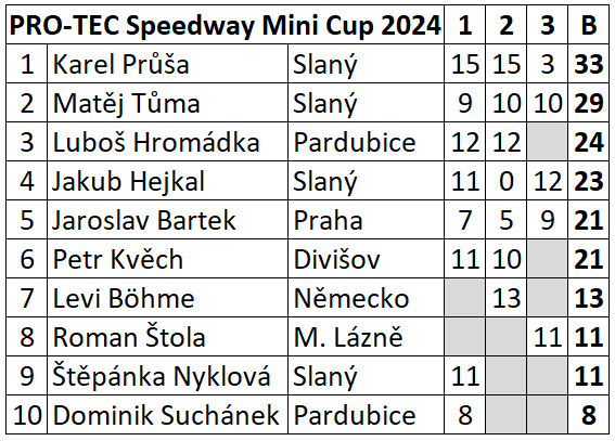 Třetí díl seriálu PRO-TEC Speedway Mini Cup, který se jel v sobotu před závodem Mistrovství ČR na dlouhé dráze. Jeho vítězem se stal slánský Jakub Hejkal, který ve finálové jízdě porazil vítězem základní části Romana Štolu, který skončil třetí, tak i druhého Matěje Tůmu ze Slaného. Favorit a vítěz předchozích dvou závodů Karel Průša skončil pátý, když po pádu ve druhé své jízdě odstoupil ze závodu.
