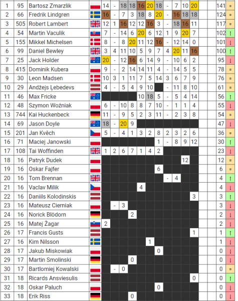 Polák Bartosz Zmarzlik udělal další krok k zisku pátého titulu Mistra světa. V lotyšské Rize ovládl finále a bere nejvíce bodů. Druhý byl Fredrik Lindgren a bronzovou medaili vybojoval Daniel Bewley. Jan Kvěch vydřel šest bodů a to stačilo na jedenáctou příčku. V celkové klasifikaci vede Zmarzlik, před Lindgrenem a Lambertem. Kvěch je patnáctý.