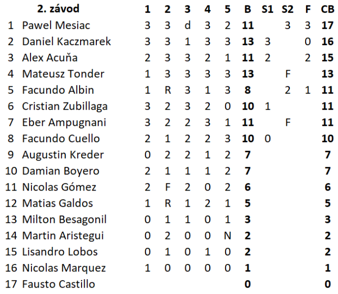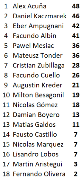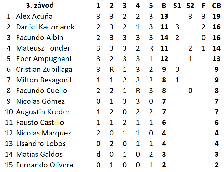 Po třech závodech mezinárodního Mistrovství Argentiny je na čele domácí jezdec Alex Acuňa. Druhou příčku drží Polák Daniel Kaczmarek a třetí je Eber Ampugnani.