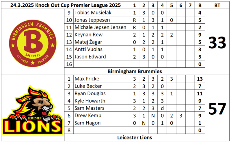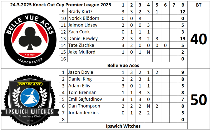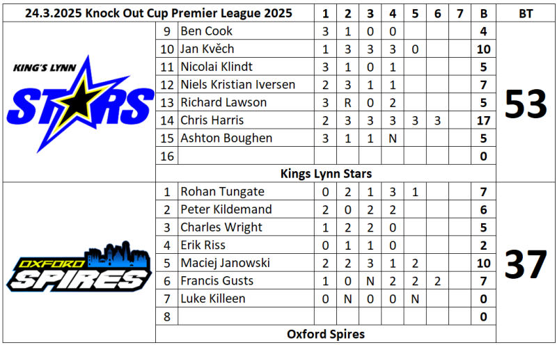 Závody Knock Out Cup byla zahájena britská Premier League. Ve třech závodech se potkali týmy Belle Vue s Ipswichem, kde měli nahoru Ipswich, Birmingham podlehl Leicesteru a Kings Lynn s Janem Kvěch zvítězili nad Oxfordem. Jan Kvěch byl v barvách Stars druhým nejlépe bodujícím jezdcem s deseti body. Excelentní výkon podal Honzův týmový kolega Chris Bomber Harris se sedmnácti body.