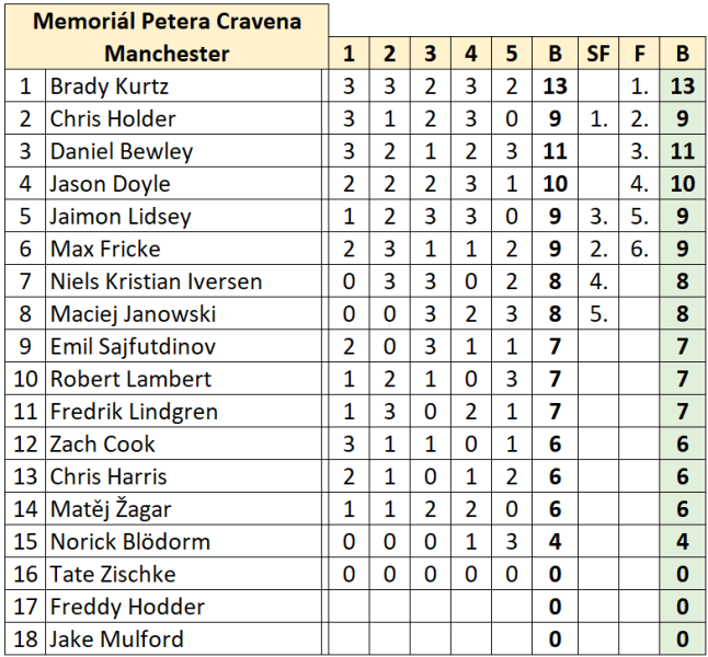 Brady Kurtz se stal vítězem Memoriálu Petera Cravena, který se jel v Manchesteru. Druhou příčku si ve finálové jízdě, která se jela podobně jako naše Zlatá přilba v šesti jezdcích, vyjel Chris Holder. Bronz bral Daniel Bewley.