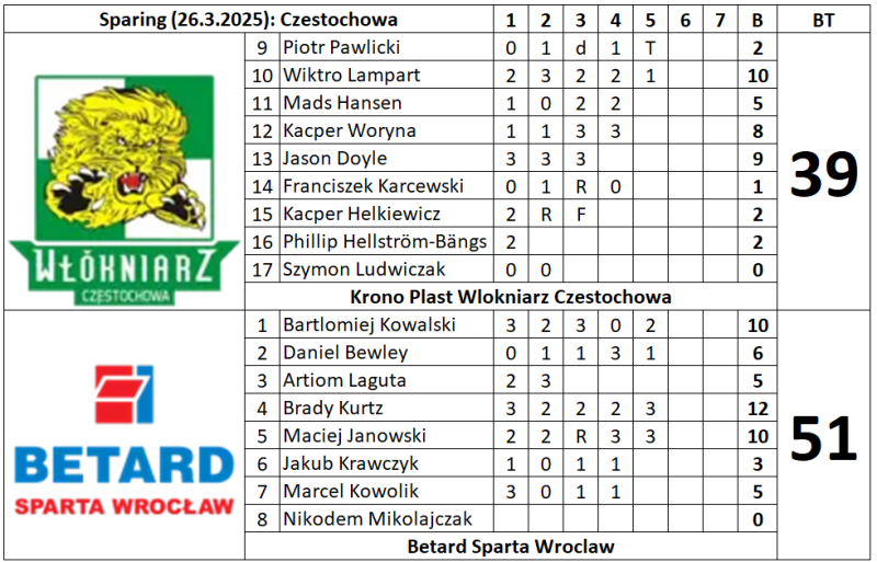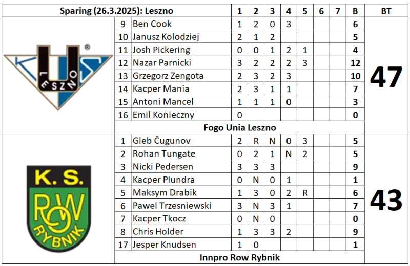 V úterý se na polských drahách opět testovalo ve vzájemných soubojích. Czestochowa vyzvala Wroclaw, ale na své domácí dráze jí podlehla vysoko 39:51. Skvěle bodoval ze tří jízd plným počtem devíti bodů Jason Doyle z Wlókniarzu. Za hostující Betard se vedlo nejlépe Brady Kurtzovi. Druhý závod sparingového odpoledne se jel v Leszně. Domácí Unia tu hostila nováčka PGE Extraligy ROW Rybnik. Tady už to vítězství tak jednoznačné nebylo. Za Leszno jel skvěle mladý Ukrajinec Parnicki s dvanácti body. Dvě esa v barvách Rybniku Nicky Pedersen a Chris Holder předvedli slušnou formu a vyjeli oba po devíti bodech.