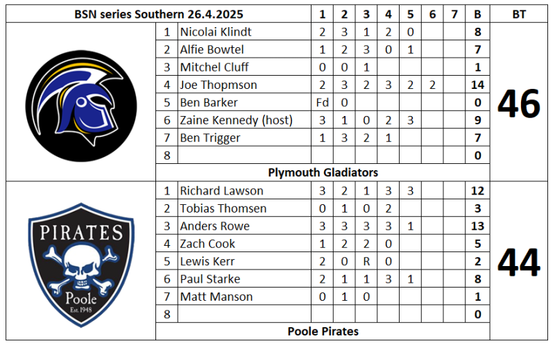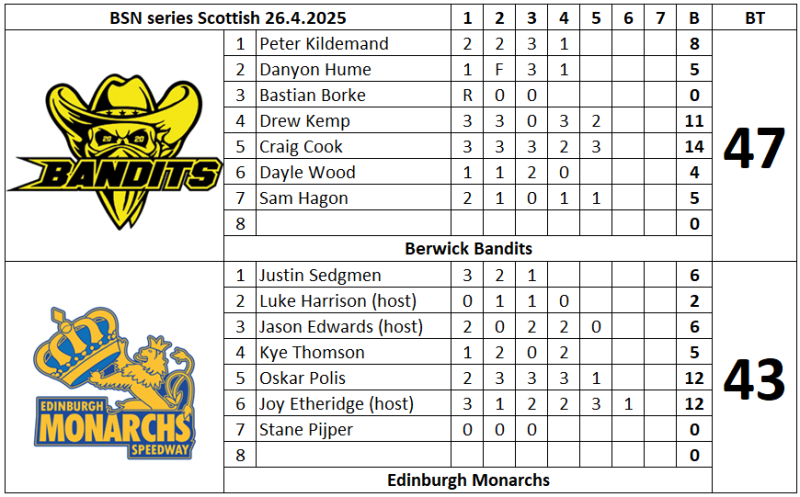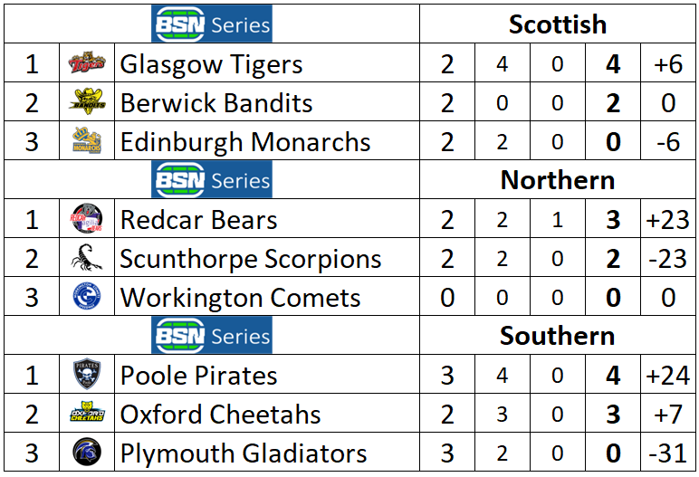 Dva závody BSN Series se jely v sobotu na britských ostrovech. Ve skotské skupině hostil Berwick Bandits Edinburgh Monarchs a porazil jej 47:43. Ve druhém závodě jen velmi těsně zvládnul na své domácí dráze Plymouth Gladiators tým Poole Pirates.