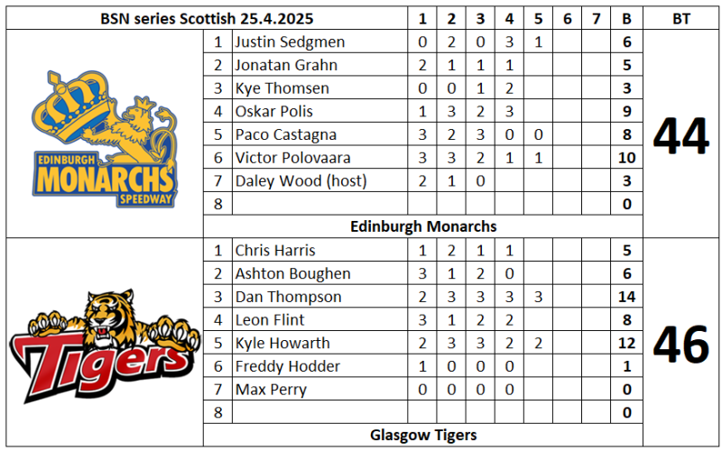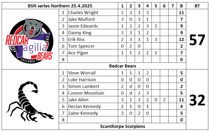 Dva závody pohárového BSN Series se jely v pátek. Redcar Bears zvítězilo nad Scunthorpe Scorpions a do tabulky si připisuje dva body a jeden bonusový, který je za součet obou výsledků vzájemného souboje. Druhý závod se jel ve skotské skupině a Edinburgh Monarchs tu jen velmi těsně podlehl Glasgow Tigers 44:46.