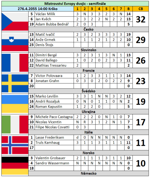 Fantastický výsledek veze ze slovinského Krška česká sestava Milík, Kvěch a Bednář, pod taktovkou Zdeňka Schneiderwinda. Z evropského semifinále dvojic postupujeme do finále z prvního místa. O tři body pozadu za českým týmem byl domácí výběr Slovinska a stupně vítězů doplnili Francouzi.