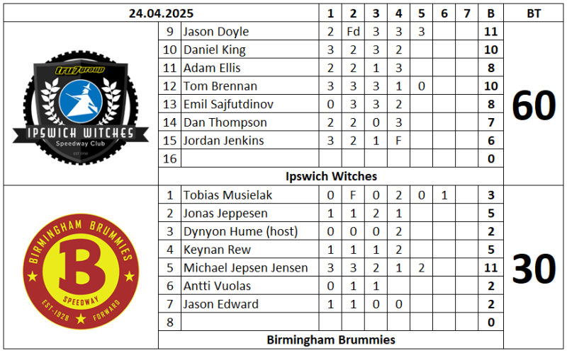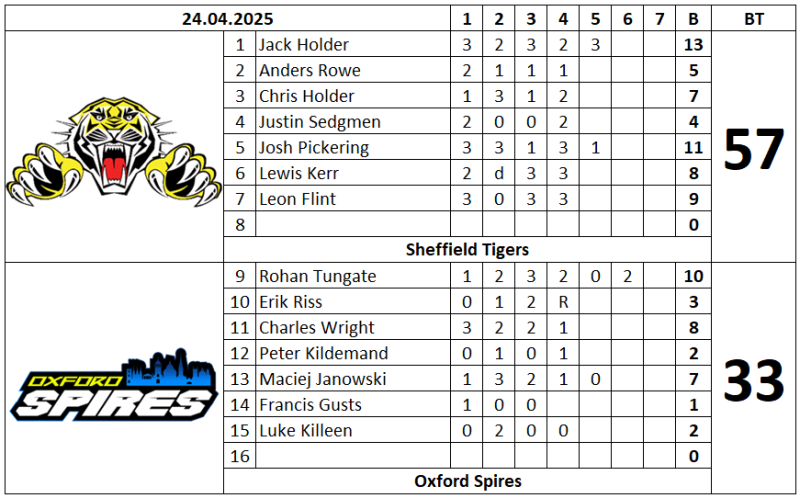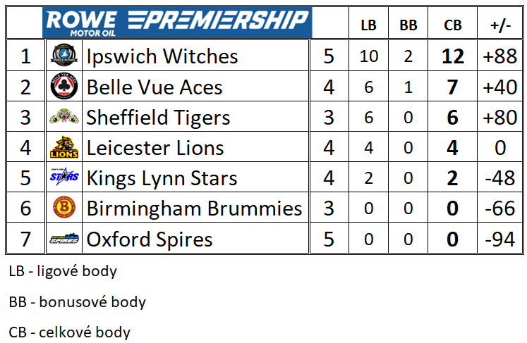 Jeden z hlavních favoritů letošní britské Premiership si ve čtvrtečním kole upevnil své vedení v tabulce výhrou 60:30 nad Birminghamem a po pěti odjetých závodech má plný počet deseti bodů. Ve druhém závodě si Sheffield Tigers poradil taky jasným výsledkem 57:33 s s posledním týmem tabulky Oxfordem Spires. Ve středu se závodilo i v nižší lize Championship. V doprovodném poháru BSN series porazil Poole Pirates Plymouth Gladiators 58:32.