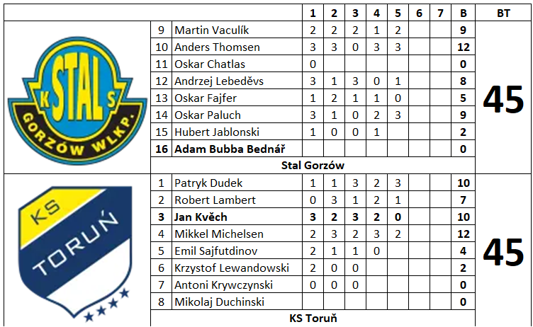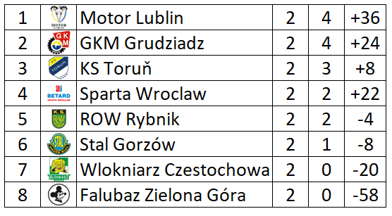 O velikonočním víkendu bylo na programu kompletní druhé kolo polské PGE Extraligy. Velmi zajímavé bylo utkání Gorzow vs. Toruň a to nejen z pohledu česko-slovenského diváka. Martin Vaculík vybojoval pro svůj tým devět bodů, Adam Bubba Bednář opět jen čekal na šanci z pozice náhradníka a Honza Kvěch vyjel skvělých deset bodů pro Toruň. Oba týmy se rozešly smírně 45:45. V ostatních závodech Grudziadz porazil Rybnik 51:39, hvězdný Lublin porazil Czestochowou 49:41 a Wroclaw doslova rozdrtila Zielonu Góru 60:30. V tabulce je ve vedení Lublin a Grudziadz se čtyřmi body. Kvěchova Toruň je třetí.