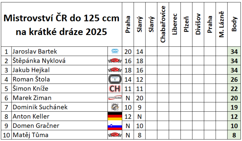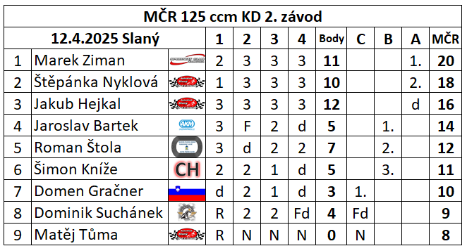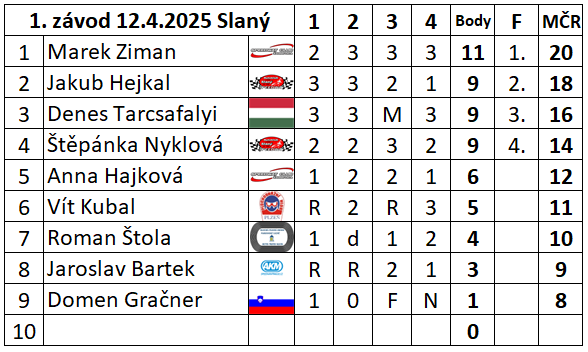 Slovenský reprezentant Marek Ziman ovládl oba závody kolibříků ve Slaném. Nejprve si vyskočil na nejvyšší stupínek ze závodu na malé dráze a poté i na té klasické. Na malé dráze byla druhá Štěpánka Nyklová a třetí Jakub Hejkal, který doplatil na poruchu ve finálové jízdě. Do té doby nepoznal hořkost porážky. Na klasickém ovále si druhou příčku vyjel Jakub Hejkal a třetí byl Maďar Denes Tarcsafalyi. V celkové klasifikaci krátké dráhy vede trojlístek jezdců s 34 body a jsou jimi Bartek, Nyklová a Hejkal. V klasifikaci na klasické dráze je ve vedení vítěz prvního závodu Ziman.