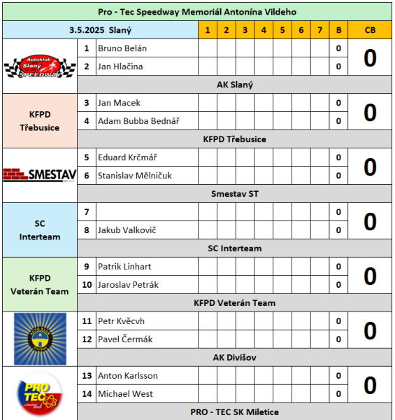 V sobotu 3.května se na plochodrážním stadionu ve Slaném bude opět závodit celý den. Dopolední program startuje v 10:00 hod. , bude se jednat o Mistrovství ČR juniorů do 125 ccm na klasické dráze. Sedmidílný seriál zde bude mít své druhé pokračování a slánské duo Jakub Hejkal a Štěpánka Nyklová tak před domácím publikem budou moci předvést svoje umění které potvrdili již při úvodním klání 12.dubna které bylo pořádáno rovněž ve Slaném. Odpoledne od 14:00 hod. je na programu XXV. ročník PRO- TEC Meeting Memoriál Antonína Vildeho , jako tradičně se jedná o závod dvojic.