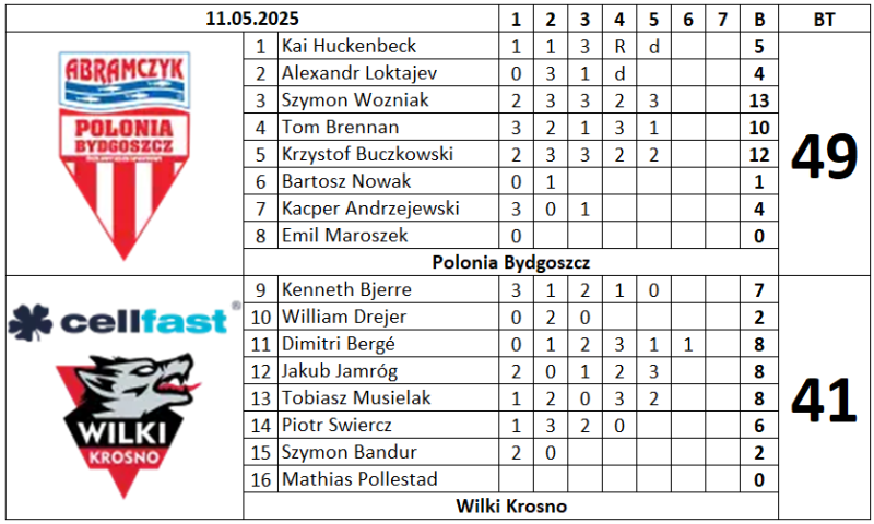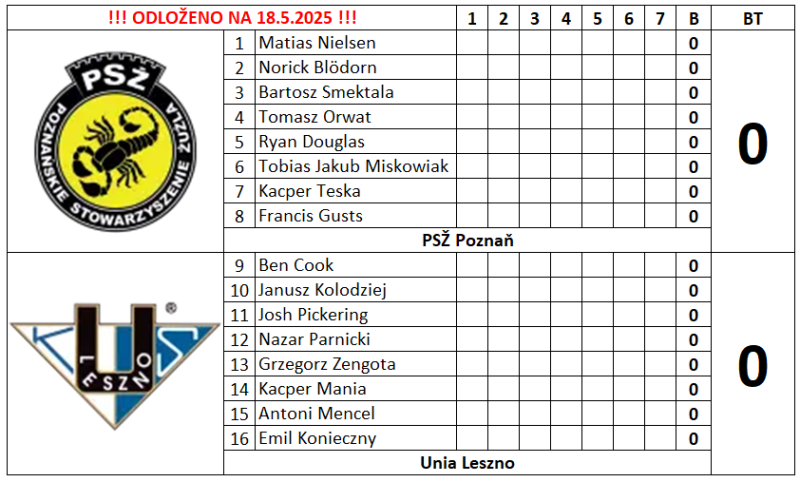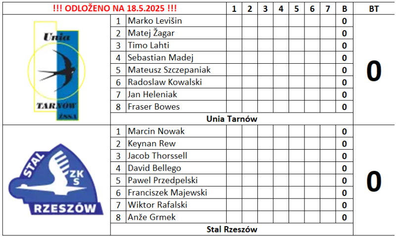 Opět nekompletní kolo se odjelo v Enae Speedway Extralize. Závody mezi Zielonou Górou a Unii Leszno a Rzeszówa proti Toruni byly odloženy na 27. května. Sklonit se před svým hostem…