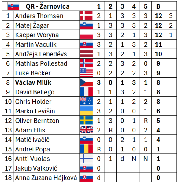 Bez českého postupu skončilo kvalifikační kolo o SGP 2026 ve slovenské Žarnovici. Vítězem se stal D8n Anders Thomsen, druhý byl Matej Žagar a třetí Kacper Woryna. Právě tito tři si své pořadí museli vyjet až v rozjezdu pořadí na stupních vítězů. Čtvrtý postupující je domácí Martin Vaculík a z páté příčky jde dále i Andžejs Lebeděvs. Těsně za postupovou čarou skončil nadějný Nor Mathias Pollestad, Luke Becker z USA, ale i náš Václav Milík.