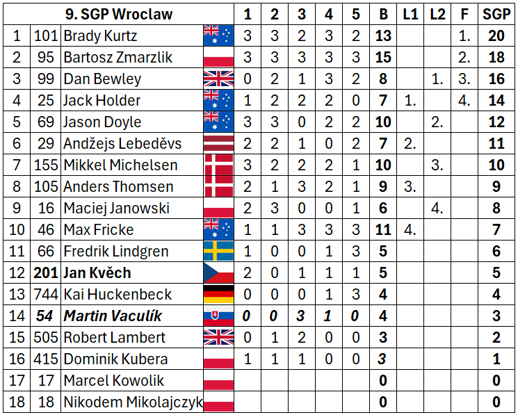 Speedway Grand Prix se přesunulo k předposlednímu závodu seriálu SGP do polské Wroclawi Do posledního místa vyprodaný stadion Olympijski viděl vítězství domácího jezdce. Stal se jim AUstralan Brady Kurtz, který je zároveň jezdcem domácího týmu z Wroclawi v polské Extralize. Proto publikum doslova šílelo a obrovským hukotem táhlo svého domácího jezdce do cíle. Druhou příčku si ve finále vybojoval Bartosz Zmarzlik, který v základní části poprvé vybojoval plný počet patnácti bodů a postupoval společně s Kurtzem přímo do finále. Z jízd poslední šance se probili do finále nakonec třetí Daniel Bewley, mimochodem další jezdec místního klubu v extralize a čtvrtý pak byl Jack Holder.