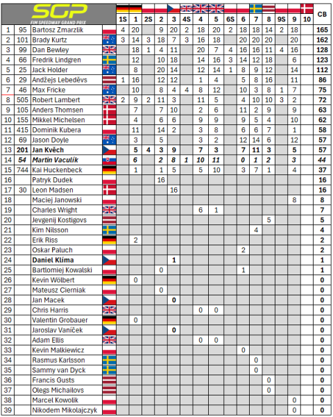 Jan Kvěch začal závod skvěle druhým místem, po něm následovala výhra, ovšem ta byla těsně před Honzovou třetí jízdou anulována a jeho prvenství se proměnilo v nulu. Důvodem bylo vyloučení za údajně povolený výfuk na jeho stroji. Honza ve zbývajících jízdách vyjel ještě tři body, ale to nestačilo na postup do jízd poslední šance. Podobně na tom byl i Martin Vaculík, který vyjezdil čtyři body a se závodem se loučil se čtyřmi body. Závodu předcházela ještě bodovaná kvalifikace. V té se do bodované jízdy dostala čtveřice Bewley, Lambert, Zmarzlik a Fricke. V tomto pořadí také dojeli do cíle a rozdělili si body do celkové klasifikace 4-3-2-1. V celkové tabulce vede stále Bartosz Zmarzlik se 165body, druhý je Brady Kurtz s body 162 a na třetí místo se vyhoupnul Daniel Bewley s body 128. Jan Kvěch si drží 57 body třináctou příčku, Martin Vaculík je o jednu příčku níže, ale jeho bodové konto čítá jen 44 bodů.