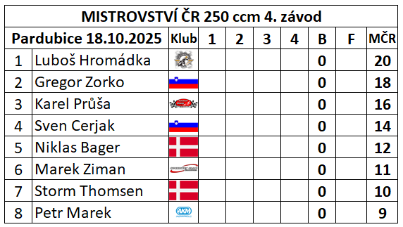 Sezóna ploché dráhy se pomalu, ale jistě chýlí ke svému konci. V Pardubicích se s tou s číslovkou 2025 rozloučí tradičně Macec Cupem a posledním závodem Mistrovství České republiky 250 ccm. Diváky tak v případě dodatkových jízd čeká něco kolem třiceti rozjížděk. Macec Cup má za sebou jeden závod v rumunské Braile, ten druhý minulý týden v polské Pile musel být odvolán, z důvodu nesjízdné dráhy. Vyvrcholení souboje středoevropských jezdců tak proběhne právě v Pardubicích. Vítězem úvodního MACEC byl Bulhar Milen Manev. V šampionátu 250 ccm zatím vede Sven Cerjak, nejlepším Čechem je druhý Karel Průša. Poslední závody v Pardubicích v letošním roce startují ve 12 hodin.