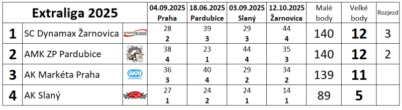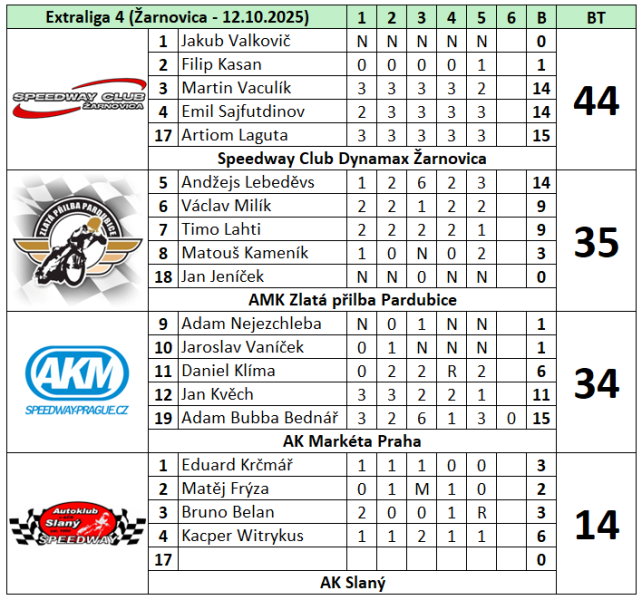 Slovenský Speedway Club Dynamax Žarnovica se stal vítězem posledního závodu české extraligy na jejich domácí dráze, bodově tak dorovnal Zlatou přilbu Pardubice a v rozjezdu Artiom Laguta porazil Andžejse Lebeděvse, čímž zajistil extraligový titul podruhé v řadě slovenskému týmu. Druhý byl v posledním závodě tým Pardubic, kterým patří i celkové druhá příčka. Třetí skončili jezdci AK Markéta Praha, ale o pouhý jeden bod v závodě a rovněž o jediný bod v celkové klasifikaci. Čtvrtá příčka jak v závodě, tak i celkově patřila AK Slaný. Letošní extraliga družstev opět přinesla mnoho zajímavých a vyrovnaných soubojů a napínavé situace do samotného konce. Tři ze čtyř závodů byly dokonce k vidění živě v TV na stanici Sporty TV.