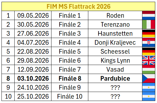 Po boku dalších kalendářů závodů pro rok 2026 vydala mezinárodní motocyklová federace FIM i kalendář závodů Mistrovství světa Flat Track. Ervín Krajčovič jako úřadující Mistr světa bude svůj titul obhajovat v deseti závodech. Osmý závod v pořadí bude posledním závodem v Evropě, jelikož se šampionát poté přesune na poslední dva závody do Argentiny a pojede se v sobotu při plochodrážním svátku v Pardubicích.